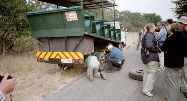 ![[Weer een lekke band]](img/3_08.jpg) Dinsdag. Vandaag krijgen we een gamedrive van een hele dag. Helaas krijgen we onderweg 3 keer bandenpech.